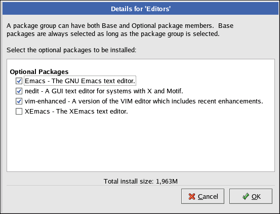 Once a package group has been selected, click on Details to view which packages will be installed by default, and to add or remove optional packages from that group.