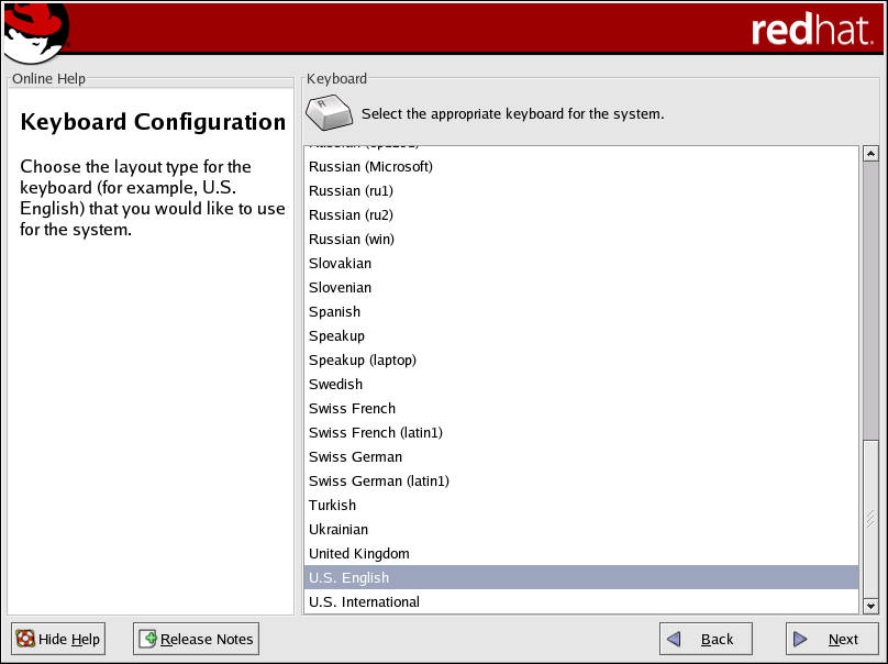 Using your mouse, select the correct layout type (for example, U.S. English) for the keyboard you would prefer to use for the installation and as the system default (refer to Figure 4-8).