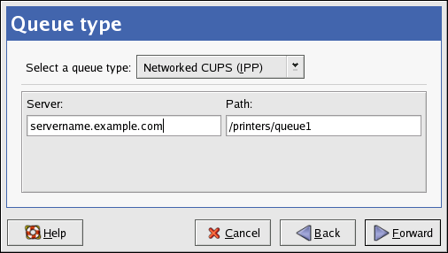 After clicking Forward, Figure 24-5 appears. Select Networked CUPS (IPP) from the Select a queue type menu.