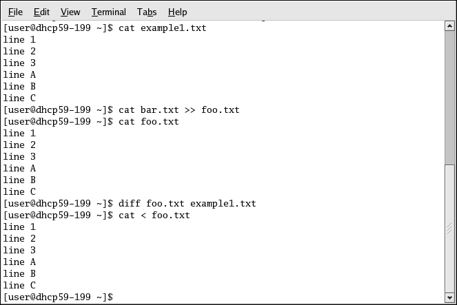 The following screen demonstrates cat's concatenate function, adding the contents of bar.txt to the end of foo.txt. Without redirection to the file example1.txt, cat displays the concatenated contents of foo.txt and bar.txt on the screen.