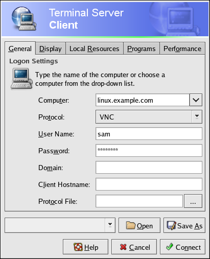 The minimal configuration for a user named "sam" connecting to a Linux desktop named linux.example.com using the VNC protocol is shown in Figure 5-3.