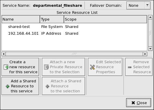 • In the Service Management dialog, select a Failover Domain from the drop-down menu or leave it as None.