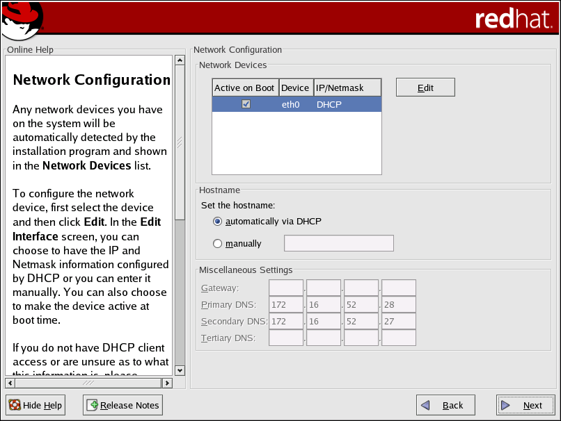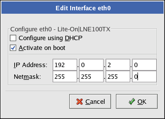 Once you have selected a network device, click Edit. From the Edit Interface pop-up screen, you can choose to configure the IP address and Netmask of the device via DHCP (or manually if DHCP is not selected) and you can choose to activate the device at boot time. If you select Activate on boot, your network interface is started when you boot. If you do not have DHCP client access or you are unsure what to provide here, please contact your network administrator.
