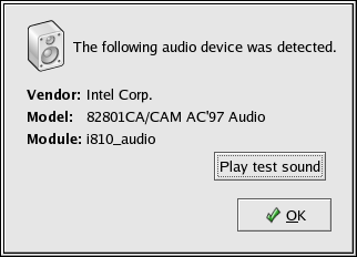 To use the Sound Card Configuration Tool, choose Main Menu => System Settings => Soundcard Detection. A small text box pops up prompting you for your root password.