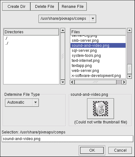 File name completion is supported by the GIMP. If you type the first few letters of a file name into the Selection field and press the [Tab] key, the only subdirectories or files beginning with those letters remain.